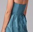 Strapless straight across neckline, full pleated party skirt. Two-tone or all one color available. Back zip. 23" skirt with pockets. Shown in teal refined silk shantung.